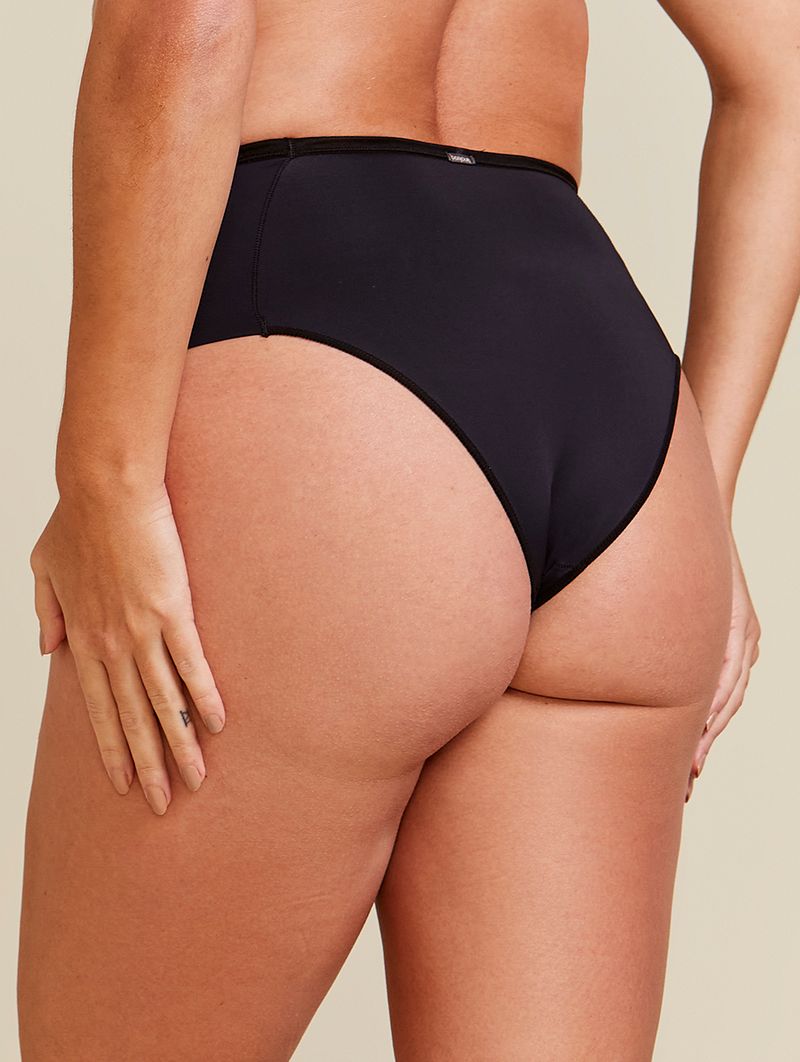 • Calcinha cintura alta • Laterais largas em tecido duplo • Cavas das pernas em acabamento invisível • Cintura em elástico dobrável, flat e confortável • Fundo 100% algodão • Confeccionada em Microfibra macia de Poliamida com Elastano